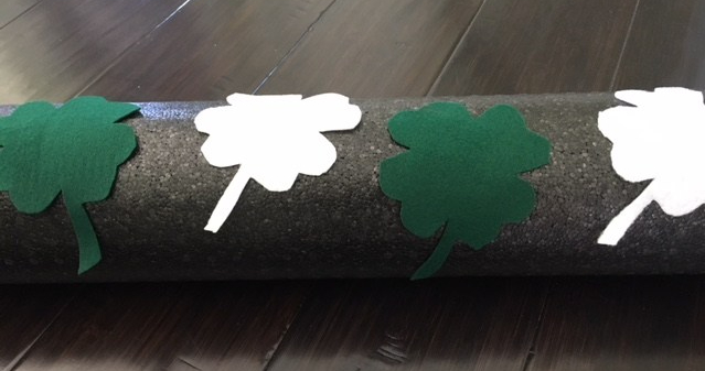 A shamrock-studded foam roller just lifts my spirits when my Irish thighs aren’t smiling. In fact, these days my thighs, legs, feet, and calf muscles aren’t “smiling” a lot because I make them run, pedal the stationary bike/elliptical machine, and do squats during the week. St. Patrick’s Day will be no exception. I’ll probably start off with 30 minutes on the elliptical machine before going straight to a party that Nate, Alex, and I have been invited to. Then, late at night, when I return home, I’ll be glad I’ve got my festive foam roller to loosen the knots forming in the back of my legs. I’m pretty sure many will be able to share in my pain. St. Patrick’s Day events in the form of 5Ks, mud runs, parades, pinching, and other shenanigans abound. Fortunately, if you partake in any of these events, you no longer have to go home to a boring foam roller, thanks to some felt and a pair of scissors.