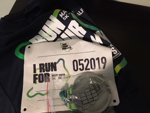 So, I entered the Dick’s Sporting Goods’ Run Your Run MyK Virtual 5K race. How did I train? Well, it all started 27 years ago, when I went to Spain and accidentally joined a mountaineering club, probably because my Spanish was not very good back then. Basically, I think I ended up on the Pyrenees, and I was wearing a pair of Penny loafer type shoes. I didn’t have any water with me, and I was scared *@##less. That’s when I knew I needed to be in better shape, so I joined an aerobics class when I somehow made it back home alive from my study-abroad trip to Spain. After about six weeks, I could actually do the full 30-minute high impact aerobics routine. Then, a friend, who was probably drunk, told me that if I could do that, I could probably run for 30 minutes. I always believe all of my drunk friends, so I found a nice grassy field and started to run. I lasted five minutes, but I dedicated the other 25 minutes to jumping jacks and aerobics. After a few more weeks, I was able to run for 10 minutes and just do 20 minutes of aerobics and so on. Eventually, I could run for 30 minutes at a 9-10-minute mile pace. I ran every day. I tried to do a marathon when I was 28 years old, but I got an overuse injury and, in my 30s and now my 40s, I’ve resigned myself to the fact that running 31-34 minutes a day, three days a week, on a flat, predictable, unexciting surface is good enough. And now, I’ve got a finisher’s medal to prove it.