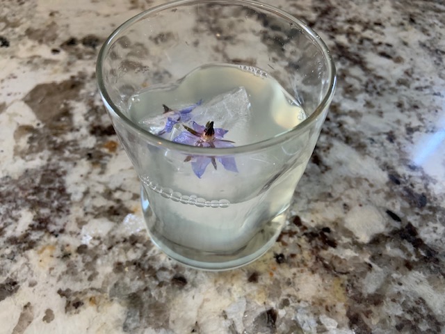 Then, the ice cubes, each with a blue borage bloom, slid so nicely into the glass. (The flower itself tasted like a honey-cucumber candy treat.)