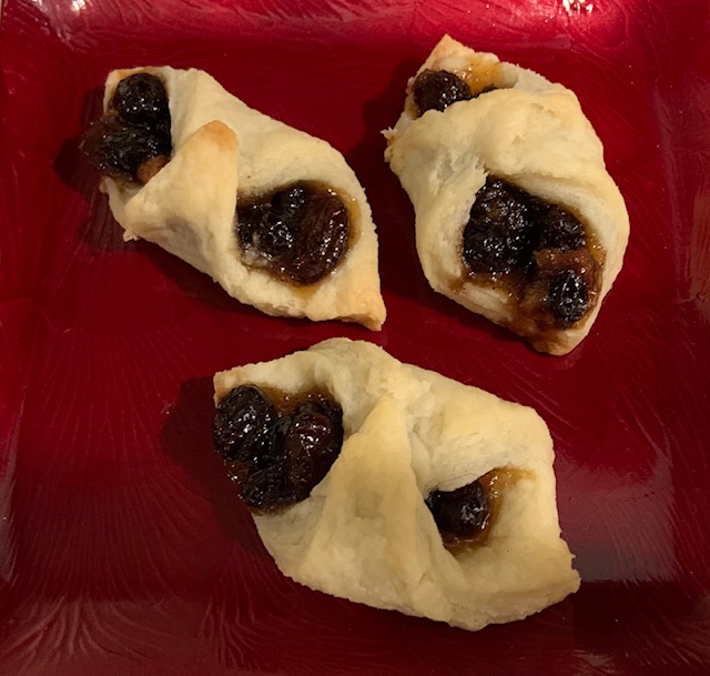 Then, I rolled out the dough and cut it into squares. In the middle, I placed about a teaspoon of mincemeat filling. Next, I folded the corners in, and baked everything at 350 for about 15-18 minutes.