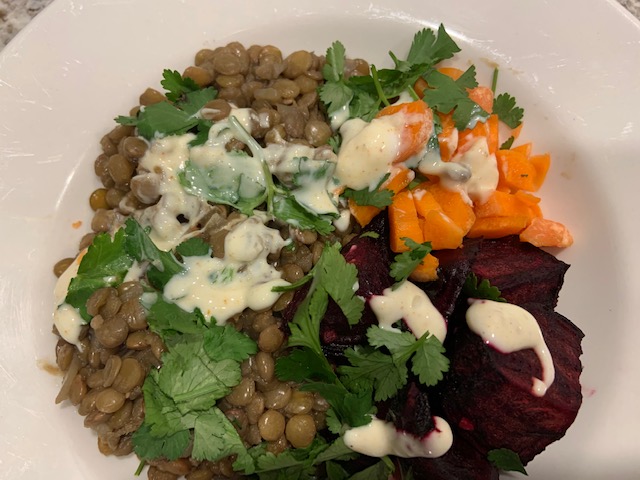 One of our favorite recipes from Chandra’s book is the “Roasted Beet & Spicy Lentil Bowl with Creamy Turmeric Dressing” (pages 128-129 and page 82).