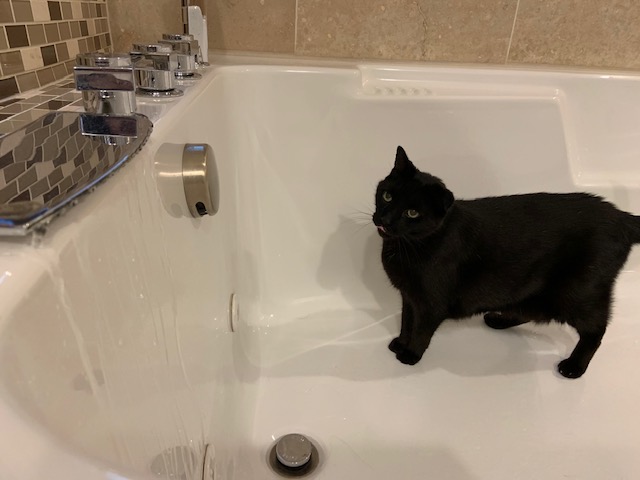 I’m impressed the cat didn’t jump out of the tub right away. Sounds like you need to teach him how to turn on a tap. (Water or beer, dealer’s choice.)